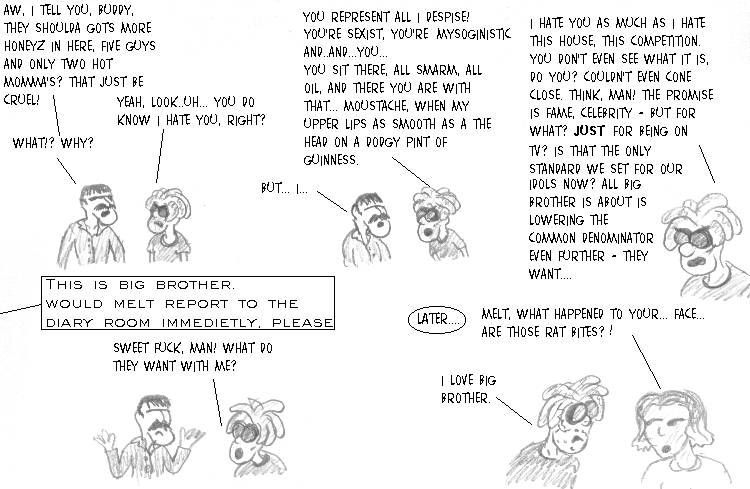"Ha!" shouts a voice from the crowd. A pair of unkempt dreadlocks force their way into view, followed by an even more unkempt Melt. "Look how I am so easily stereotyped. Pigeonholed. Compartmentalized. Stuck with a clean label and placed neatly on a shelf. That's why I'M here. I don't care about the money. I just want to shake the world out of its complacent sloth and show everyone the truth!" He looks around and notices that nobody is paying any attention. He sighs. "Damn. I hope they have cable here," he mutters as he meanders up to the front door.